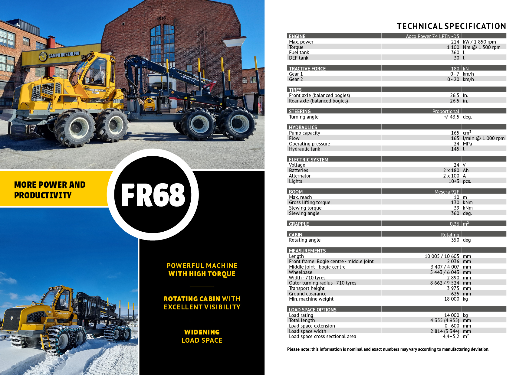 The FR68 forwarder is a completely new machine model. The machine is meant for later thinnings and final cutting, where great capacity is required from the machine. The nominal load capacity of the machine is 14 ton. The load space is easily modified, which makes the machine more usable in different conditions and with different load lengths. The FR68 has been designed to work alongside the SAMPO ROSENLEW HR86 harvester. Together they form a highly efficient and modern harvesting team.