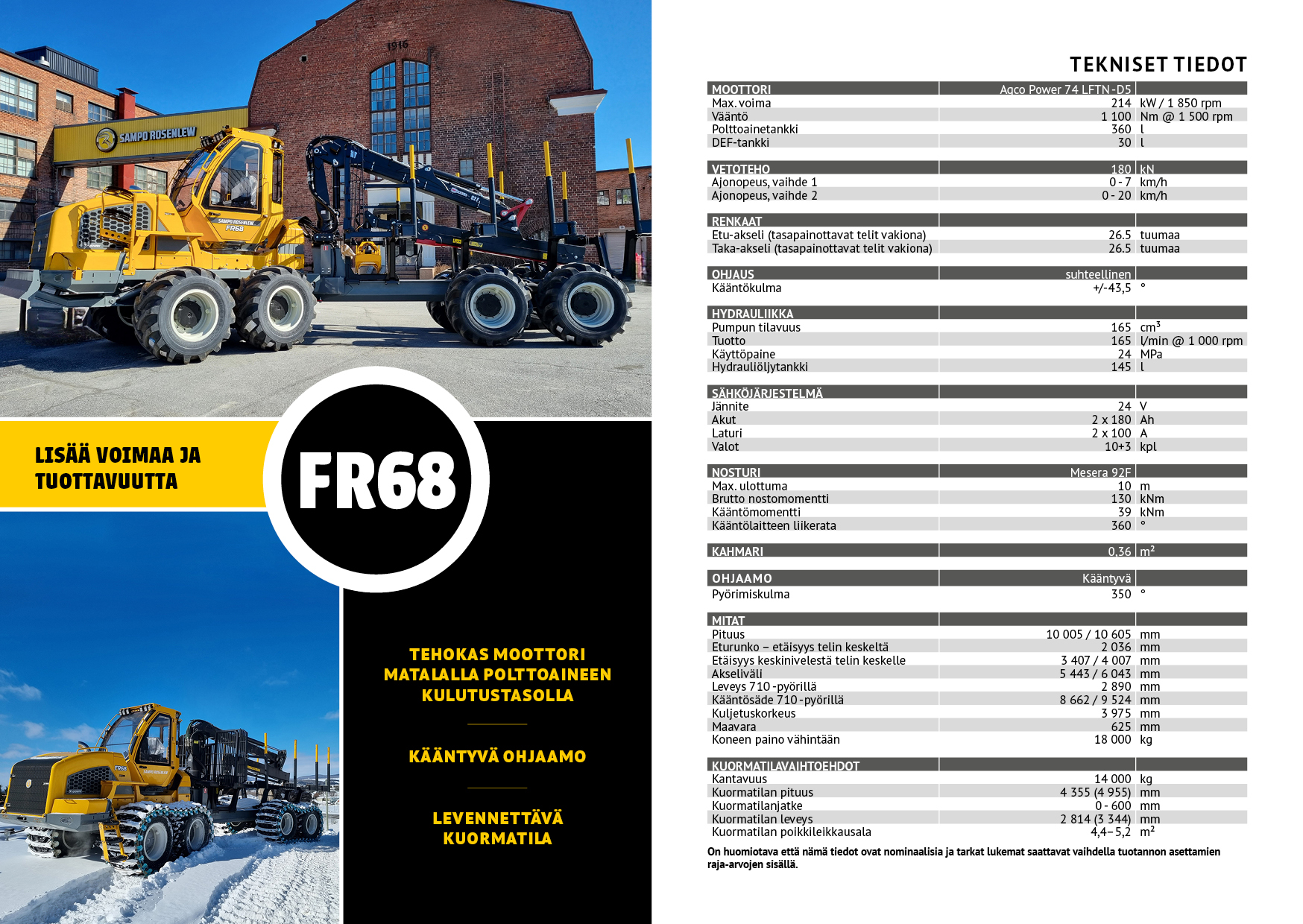 FR68 kuormatraktori täysin uusi konemalli. Sen on omimmillaan myöhemmillä harvennuksilla ja uudistushakkuilla, joilla koneelta halutaan suurta kapasiteettia. Koneen nimelliskuormakyky on 14 tonnia. Kuormatila on helposti muunneltavissa, mikä laajentaa koneen käytettävyyttä eri olosuhteissa ja tavaralajipituuksille. FR68 on suunniteltu työpariksi Sampo Rosenlew FR86 harvesterille. Yhdessä ne muodostavat huipputehokkaan ja nykyaikaisen hakkuuketjun.